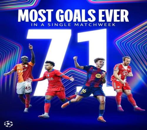 这个创纪录的单轮进球数统计自欧冠19992/93赛季改制为欧冠联赛小组赛后,不包括1999/2000至2002/03赛季第二阶段小组赛。此前的纪录是2024/25赛季第5轮和2025/26赛季第1轮(67球,18场比赛),2024/25赛季第5轮多达9场比赛至少进5球,2025/26赛季第1轮只有5场比赛进球数至少5球。本赛季第1轮尤文图斯4比4多特蒙德单场打出8个进球,但被本赛季第3轮勒沃库森2比7大巴黎超越。
